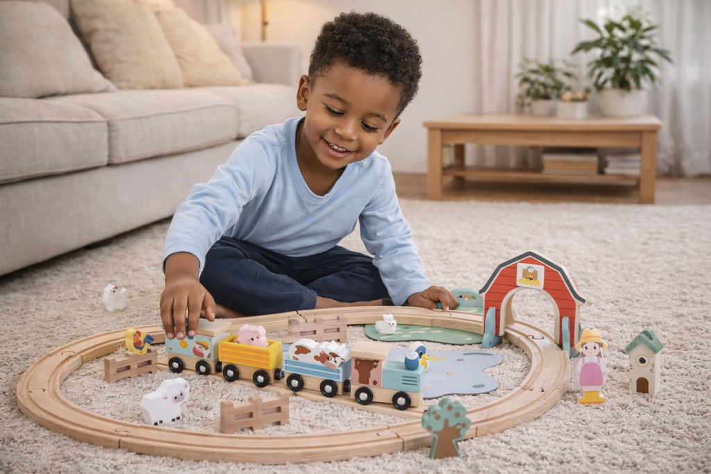 Playing with wooden trains helps children develop problem-solving skills, spatial awareness, and an understanding of cause and effect as they construct tracks and guide the train along its route.