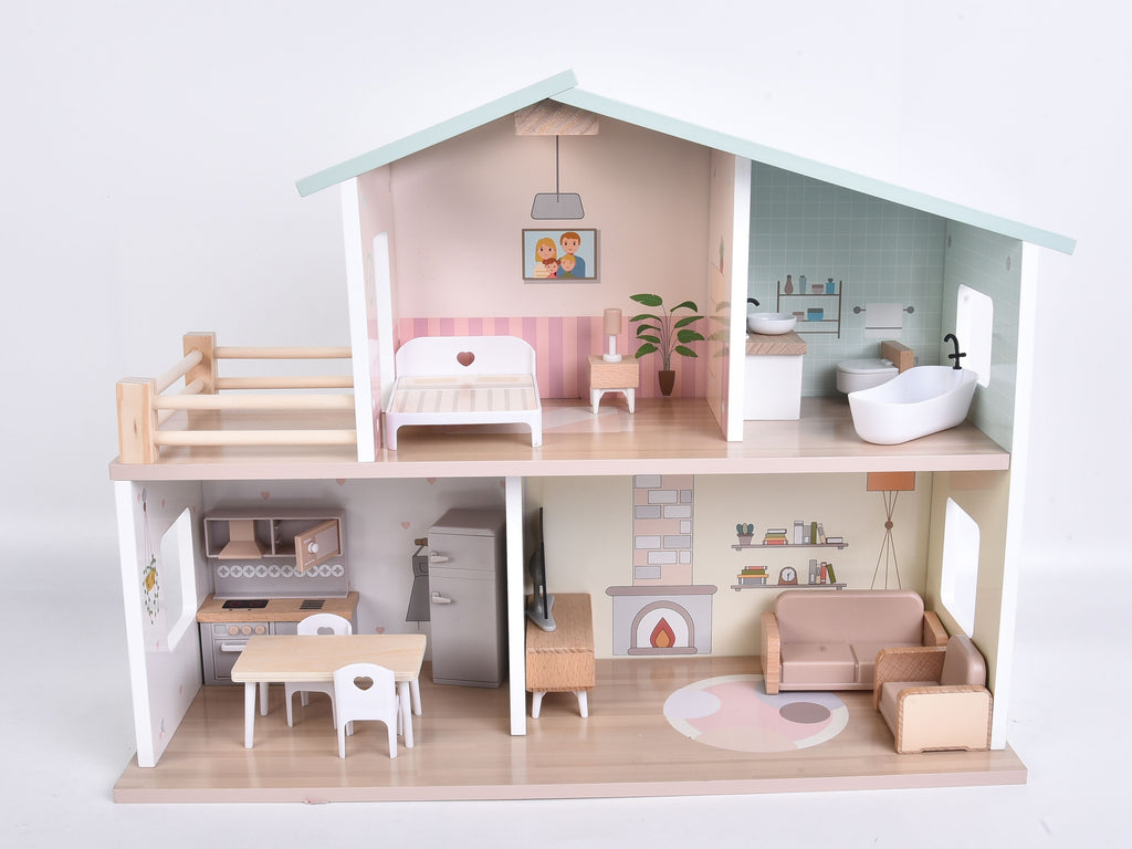Bring playtime to life with this beautifully crafted 2-story dollhouse. Featuring four fully furnished rooms—a kitchen, living room, bedroom, and bathroom—each decorated with wall art and complete with miniature wooden furniture. Soft pastel tones and natural wood accents create a calming, whimsical look. The open-front design makes play easy and interactive, inspiring creativity, storytelling, and hours of fun.