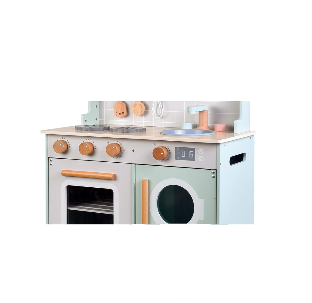 Inspire culinary creativity and hours of imaginative play with the beautifully crafted Zookabee Chef's Kitchen! Designed with a charming modern aesthetic and soft pastel tones, this wooden play kitchen is a stylish and functional addition to any playroom.