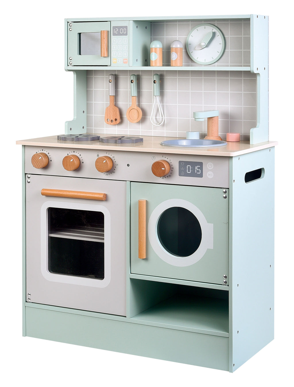 Packed with interactive features, it includes a microwave, oven, stovetop, sink, and even a washing machine – just like a real kitchen! Your little chef can turn the clicking knobs, open and close the appliance doors, and whip up imaginary meals using the included utensils and accessories. A clock, spice shakers, and hanging hooks add to the realistic experience, helping kids learn about time, routines, and organization as they play.