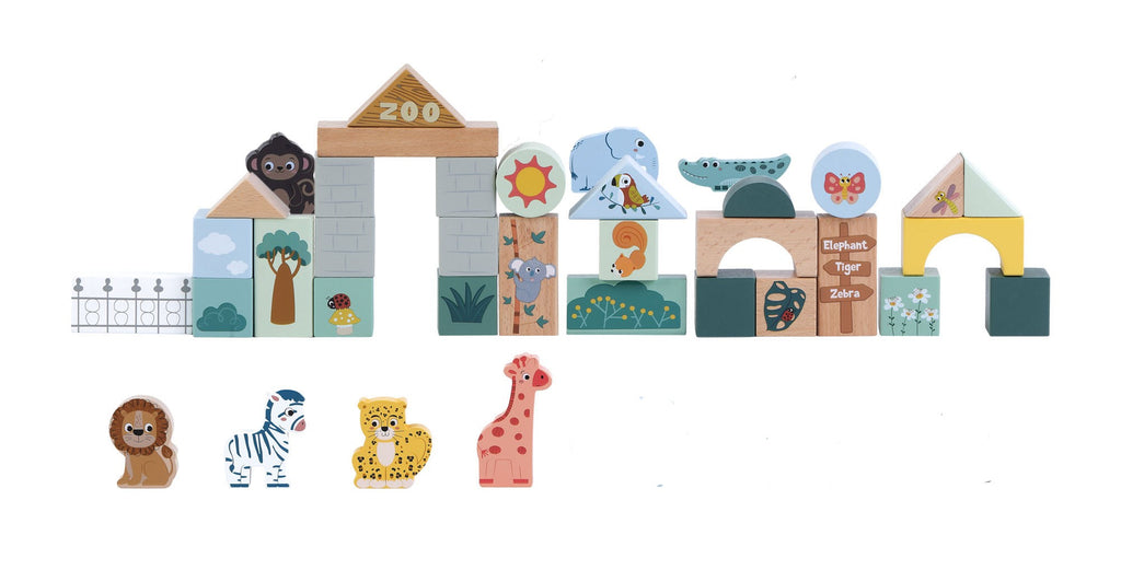 The Zookabee Wooden Zoo Blocks - 50pc set invites little explorers to build their very own zoo filled with colour, creativity, and adorable animal friends. This charming playset features beautifully crafted wooden blocks and characters, including lions, zebras, giraffes, elephants, and more – each designed with delightful detail and safe for little hands.
