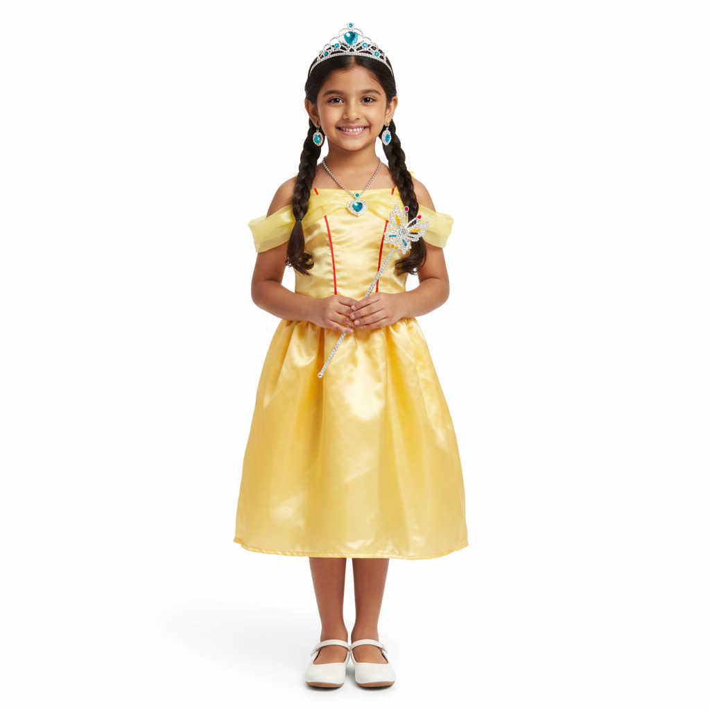 Your little princess will feel like royalty every time she puts on this gorgeous yellow satin gown! Quality construction with lace and silver trim and other intricate detailing, this will be a dress-up favorite.